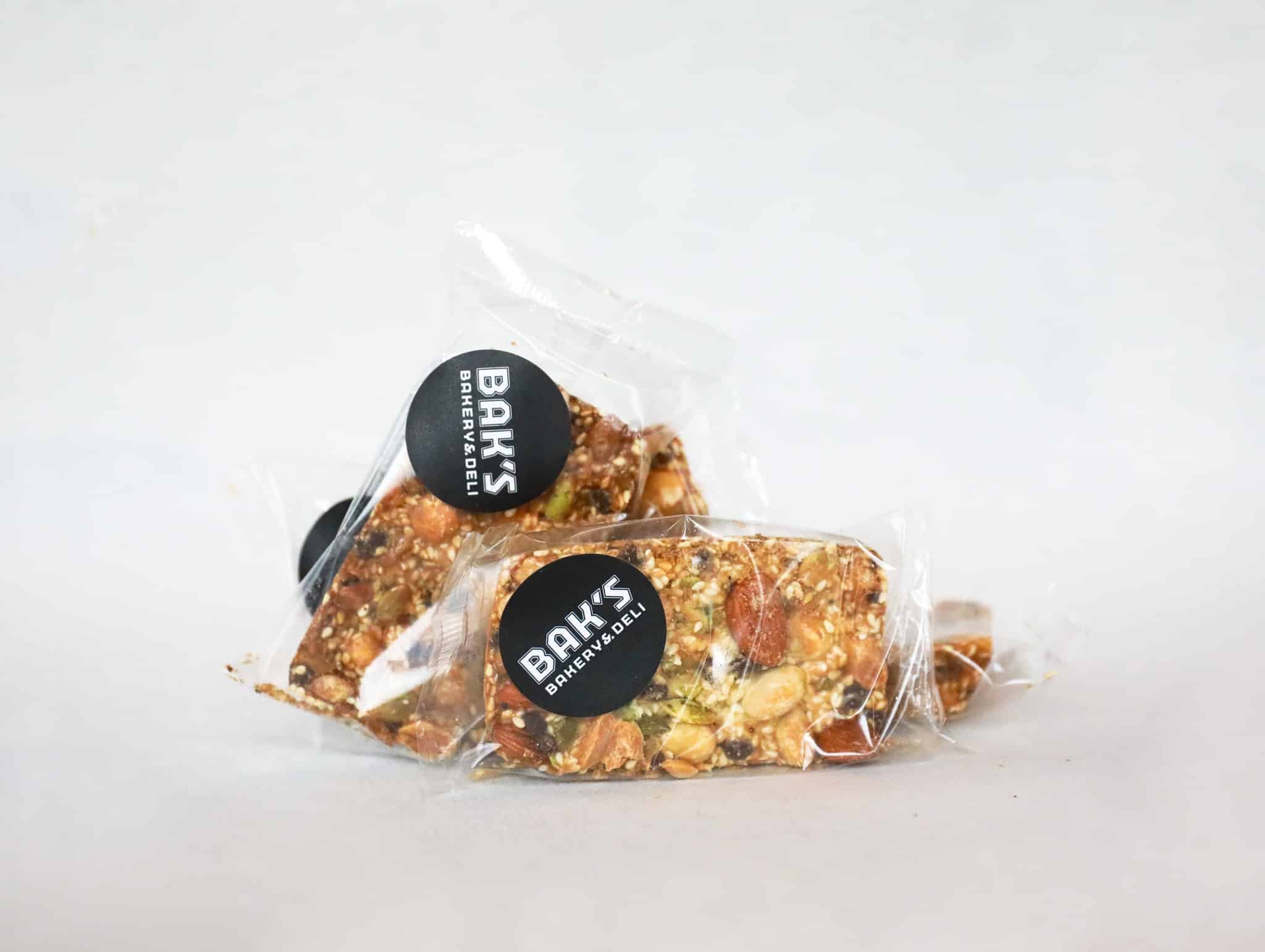 En god snack til cykel- eller løbeturen. En blanding af mandler, hasselnødder, græskarkerner, sesamfrø, jordnødder og mørk chokolade. Tilsat glukosesirup, druesukker og honning. Bagt uden kornprodukter. Sælges i pakker af 6 stk.