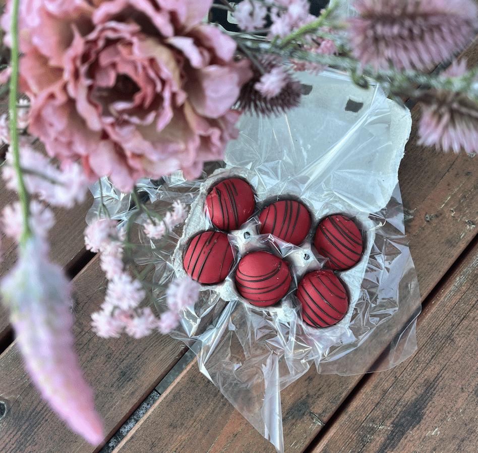 6 stk. påskeæg med passionsfrugt chokolade.
