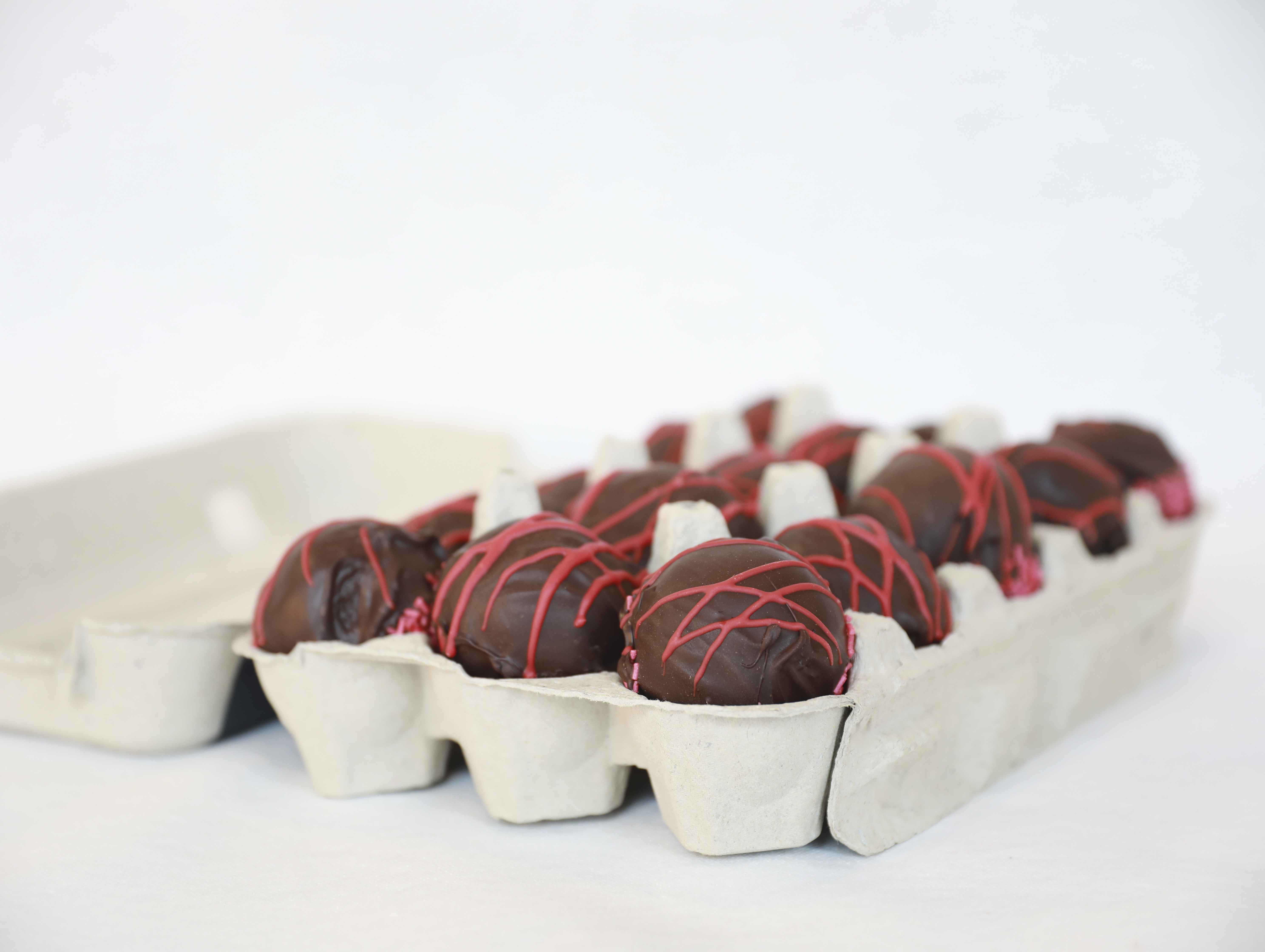 Vores romkugle fyldt med pebermynteolie og lækre stykker pebermyntechokolade. rød sukkerkrymmel i bunden. Til sidst er den pyntet med striber af hvid chokolade, der er farvet med rød nuance.